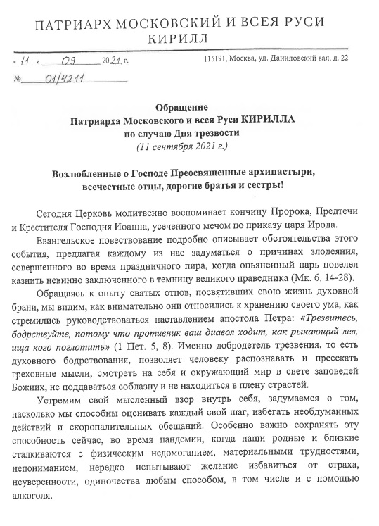 11 сентября, в Субботу, в день усекновения главы Пророка, Предтечи и Крестителя Господня Иоанна была отслужена Божественная Литургия. По окончании Литургии было зачитано обращение Патриарха Московского и всея Руси Кирилла по случаю Дня трезвости, отслужен молебен о страждущих недугом винопития или наркомании и панихида.