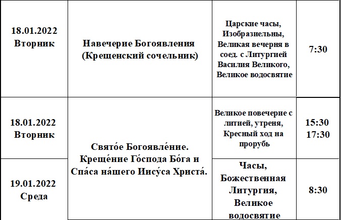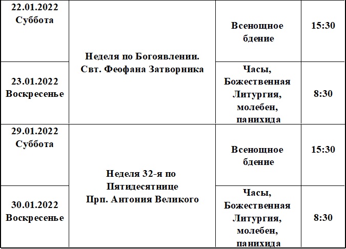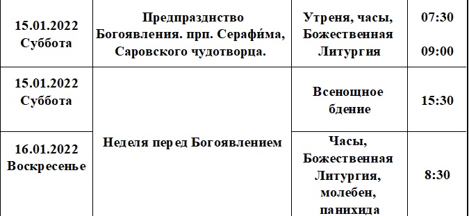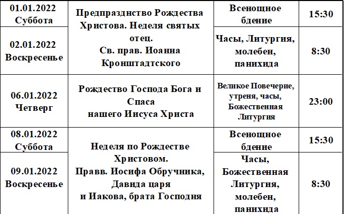 Расписание богослужений на январь 2022 года в храме Рождества Пресвятой Богородицы деревни Алайыэ