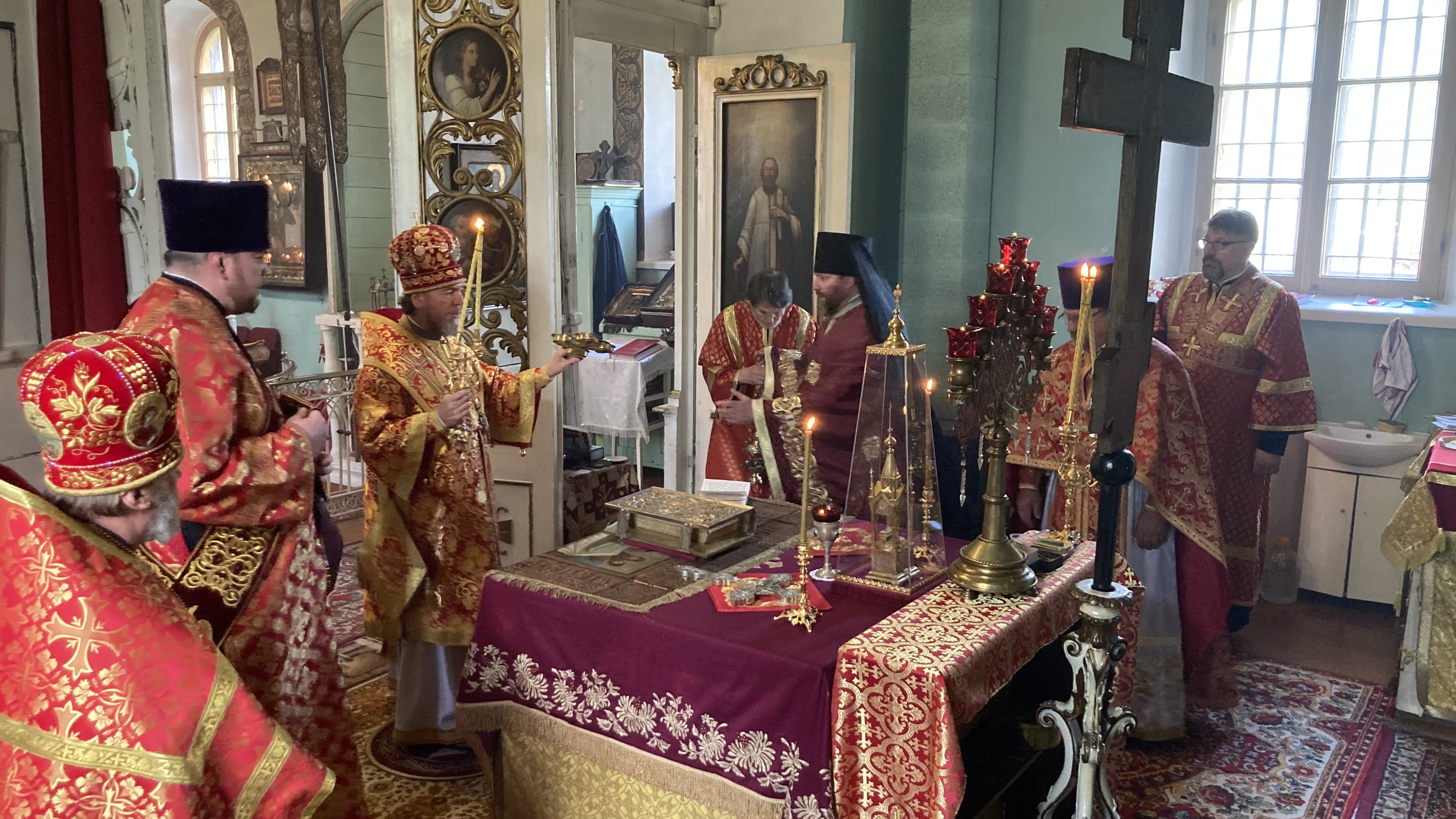 Ему сослужили: благочинный Причудия и настоятель храма святителя Николая города Муствее иеромонах Илья (Сорокатый), настоятель храма Животворящего Креста Господня города Йыгева протоиерей Владимир Соколов, настоятель храма Рождества Богородицы деревни Алайыэ иерей Даниил Доронин и настоятель храма Сретения Господня деревни Варнья иерей Петр.